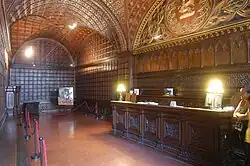 The Collegio della mercanzia, located in the second fondaco to the right of the Portale Maggiore, is entirely covered in late Gothic wooden decoration.[9]