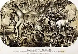 After the Great Exhibition of 1851 in London, The Crystal Palace at Hyde Palace was taken down and moved to a new location in South London. The Crystal Palace reopened in 1854, and one of the new exhibits was sculptor Benjamin Waterhouse Hawkins' life-sized concrete dinosaur models, the Crystal Palace Dinosaurs. The Dinosaur exhibit was a great success and very popular.[1] Hawkins came to America in 1868 and displayed a mounted dinosaur skeleton in Philadelphia. Inspired, in 1868 Manhattan's newly created Board of Commissioners of Central Park (BCCP), headed by Comptroller Andrew H. Green, recruited Hawkins to create replicas of these ancient giants for a proposed museum in Central Park. He accepted the commission in May 1868. The museum was to have been known as the Paleozoic Museum (or Palaeozoic Museum); despite the name, it was intended to be a museum of all antediluvian history, not merely the Paleozoic period.[2] Foundations for the structure were laid by architect Frederick Law Olmsted at Central Park West and 63rd Street. Like Hyde Park's Crystal Palace, Hawkins' display was to be housed within a great iron frame and an arched glass roof. Surviving sketches and photographs show that Hawkins had planned an elaborate, if anachronistic, menagerie, mixing Mesozoic dinosaurs, plesiosaurs, and mosasaurs with extinct Cenozoic mammals.[2][3]