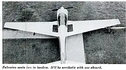 In 1965, the original Palomino was modified to a tandem-seater with a 150 hp Avco Lycoming O-320 engine. Its span is now 28 feet 2 inches and length: 20 feet 7 inches but retained the N40J registration number.