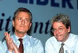 Gentiloni slowly abandoned far-left ideals, sharing more moderate views and becoming particularly involved in green politics and ecologism.[23] During those years he became a close friend of Chicco Testa who helped Gentiloni to become director of La Nuova Ecologia ("The New Ecology"), the official newspaper of Legambiente. As director of this ecologist newspaper he met the young leader of Federation of the Greens, Francesco Rutelli and became, along with Roberto Giachetti, Michele Anzaldi and Filippo Sensi, a member of the so-called "Rutelli boys", a group formed by Rutelli's closest advisors and supporters.[24]