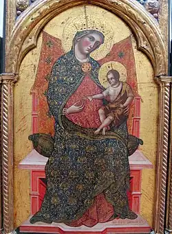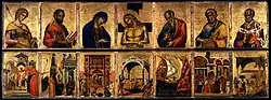 He led the development in Venice of the elaborately framed polyptych or "composite altarpiece" form, which became popular all over Italy during the 13th century, partly in response to liturgical changes (only reversed in the 20th century) which placed the priest celebrating mass on the same side of the altar as the congregation, so with his back to them for much of the time. This encouraged the creation of altarpieces behind and above the altar, as a visual devotional focus.[6] He is the oldest Venetian painter whose name is known, and the earliest to paint the new subject of the Coronation of the Virgin.[7][8]