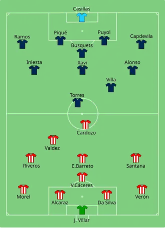 The first half of the match finished goalless, although both sides had chances to score and Paraguay's Nelson Valdez had a goal ruled out as offside. The match suddenly became eventful in the second half due to a string of penalty kicks. First, Óscar Cardozo was pulled down by Gerard Piqué in Spain's penalty area and Paraguay was awarded a penalty. Cardozo took the penalty himself but it was saved by Spain's goalkeeper Iker Casillas. Spain soon after launched an attack at the other end of the field, in which David Villa was ruled by the referee to have been brought down by Antolín Alcaraz. Xabi Alonso stepped up to take the penalty kick and seemed to have scored, only for the referee to order it be retaken because of encroachment by a Spanish player into the penalty area before the kick was taken. Xabi Alonso's retake was saved by Paraguayan goalkeeper Justo Villar. As a result, the score remained 0–0 after the three penalty kicks. Spain, however, ultimately managed to take the lead in the 82nd minute: David Villa collected a rebounded shot off the post from Pedro, to score himself off the post. The goal turned out to be the winner for Spain.[12] After the match, Spain coach Vicente del Bosque conceded that his side were not playing at their best and were starved of possession. He also noted his view that Spain's next opponents Germany were the best team at the World Cup.[13] Paraguay coach Gerardo Martino stated he would be leaving his position at the end of his contract.[14]