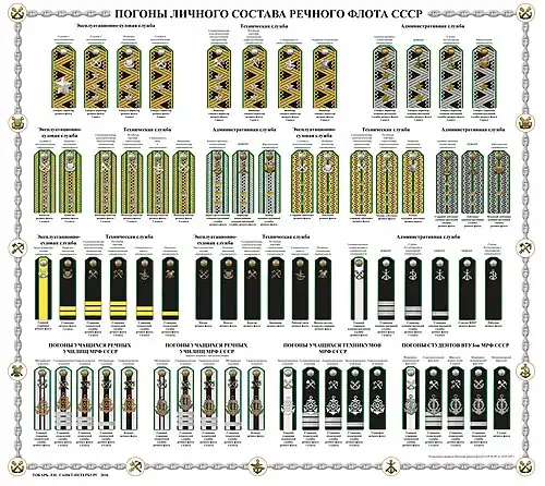 Until 1961, each departmental paramilitary guard had its own personal ranks, uniforms and insignia. For example, in 1947, the Ministry of River Fleet of the USSR installed an emblem for paramilitary protection – two cross-crossed rifles at anchor. For the paramilitary guards of the Ministry of Railways, in 1949 the Supreme Soviet of the Soviet Union introduced personal ranks similar to those used in the Soviet Armed Forces (for example, junior sergeant of paramilitary security, colonel of paramilitary guard)