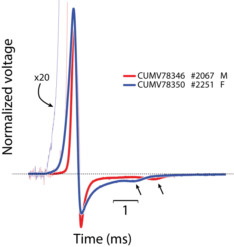 Paramormyrops hopkinsi is a species of freshwater electric fish. It was discovered in the Ivindo River in Gabon, in west-Central Africa by Dr. Carl D. Hopkins of Cornell University.[1][3][4] It is distributed throughout the Ivindo River basin of Gabon and the Ntem River basin of Cameroon.[2] Described originally as a Brienomyrus in 1985[1] it was transferred to Paramormyrops in 2007.[5] The electric discharge has two phases: a head-positive phase followed by a head-negative phase. The mean duration of the EOD is 2.8 ms for females, 2.96 for males. The Fourier transform of the EOD peaks at 536 Hz for females, 468 for males. Both male and female EODs have a head-negative voltage bump about 5 to 6 ms after the main head positive phase (arrows).