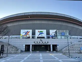 It is a dome-shaped building with one underground and three above-ground floors. A variety of indoor sports can be played on its main arena, including basketball, volleyball, handball, badminton, and ssireum (Korean wrestling).[1][2] It has 6,277 seats, with 1,312 of those being deployable depending on the need. There is also a deployable stage that can be placed on the arena.[1] A variety of other sports can be played on the first floor of the building in smaller facilities, including table tennis.[1][3] A weight room, offices, shower rooms, and referee rooms are also present.[1][3] The venue has also hosted a variety of other non-sporting events, including job fairs and cultural events.[1]