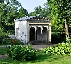 The Stibadium was designed by Friedrich Ludwig Persius and built on the site of a neoclassical greenhouse with a garden room(built after 1796) in 1840.[16]: 63  The semi-circular Tholos structure with a wooden half-cone roof was the main place for having tea. On the underside of the roof a twelve deities programme is painted. As there are 14 fields the Twelve Olympians were supplemented with Bacchus and Amphitrite. The middle pillar had originally a zinc-cast Kore designed by August Kiss which later was replaced with a marble copy of the Felicitas Publica in the monument Max-Joseph Denkmal by Christian Daniel Rauch in Munich.[17] On the terrace stands a granite bowl by Christian Gottlieb Cantian which Charles inherited after his father died in 1840. The Stibadium had the function to be a shield between pleasure ground and Drive. It had also the opposite purpose of the Curiosity pavilion. While looking on the common people from such an elevated and prestigious building the Prince's tea party was on show to the people at the same time. The paintings of the Twelve Olympians may seem presumptuous, yet they are an artistic expression of how Prussian aristocrats saw themselves in the age of European Restoration.