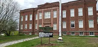 Springfield's Park Street School is located across the Black River from the town center, on the south side of a climbing bend in Park Street. The building consists of two large blocks joined by a recessed connecting wing. The older portion of the building, built in 1895-6 is to the right, while the left side and connector were added in 1929. Both main blocks feature Classical Revival styling. The older one has a three-section facade, with a projecting central entrance bay flanked by large round-topped windows. The entrance bay is itself three bays wide, articulated by pilasters and topped by a triangular pediment. The 1929 block echos some of these features, with a similar central bay flanked by bays of large sash windows on each of its floors.[2]