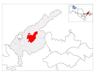 Parkent is a district of Tashkent Region in Uzbekistan. The capital lies at the city Parkent.[1] It has an area of 1,080 km2 (420 sq mi)[2] and it had 157,500 inhabitants in 2021.[3] The district consists of one city (Parkent), 3 urban-type settlements (Quyosh, Qoʻrgʻontepa, Chinorli) and 9 rural communities (Zarkent, Qoraqalpoq, Boʻston Chotqol 37-maktab , Nomdanak, Parkent, Soʻqoq, Xisarak, Boshqizilsoy, Changi).[1]