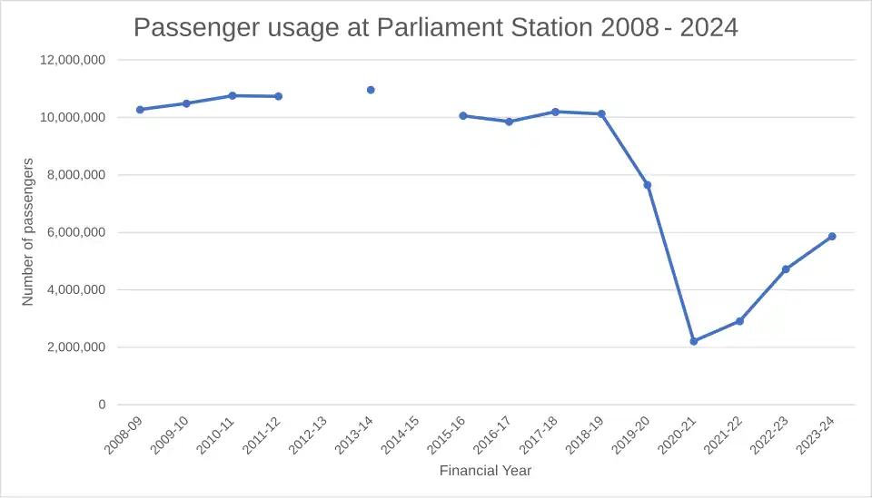 Passenger usage at Parliament Station between 2008 and 2024 sorted by financial year.