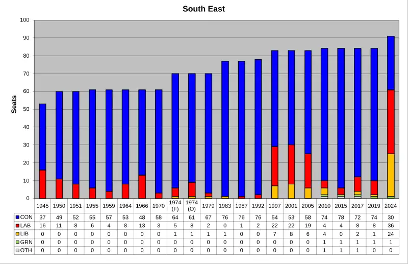 The region[1] of South East England is divided into 91 parliamentary constituencies, which are made up of 27 borough constituencies and 64 county constituencies. Since the general election of July 2024, 35 are represented by Labour MPs, 30 by Conservative MPs, 24 by Liberal Democrat MPs, 1 by a Green MP, and 1 by an independent MP.