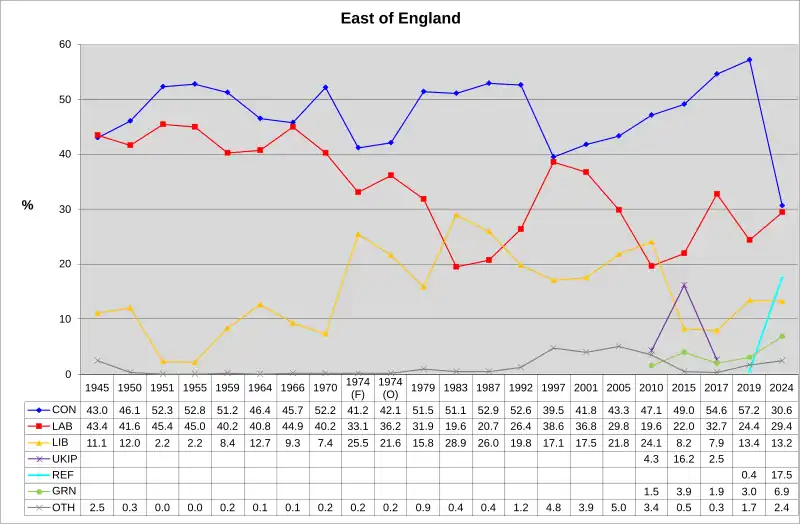 The region[1] of the East of England is divided into 61 parliamentary constituencies which is made up of 14 borough constituencies and 47 county constituencies. Since the general election of July 2024, 27 are represented by Labour MPs, 23 by Conservative MPs, seven by Liberal Democrat MPs, three by Reform UK MPs, and one by a Green MP.