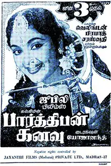 Parthiban Kanavu (transl. Parthiban's Dream) is a 1960 Indian Tamil-language historical fiction film, directed by D. Yoganand. The film stars Vyjayanthimala, Gemini Ganesan and S. V. Ranga Rao, with Ragini, S. V. Subbaiah, Kumari Kamala, T. S. Balaiah, P. S. Veerappa and S. A. Ashokan in supporting roles.[1] It is based on the 1942 historical novel of the same name, written by Kalki Krishnamurthy.[2] The film also had actor K. Balaji in a special appearance and actress B. Saroja Devi as an extra.