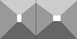 The picture surface of Vanishing Venice (above) is three-dimensional, made of two pyramids with their tops cut off protruding towards the viewer: the bases of the pyramids are farthest away (flat against the wall), while the flat tops (shown as the two lighter rectangles in the diagram, right) are those parts which are physically nearest to the viewer but which appear, in the picture, to be in the distance at the end of the buildings.