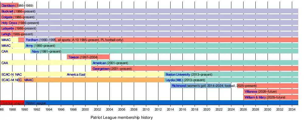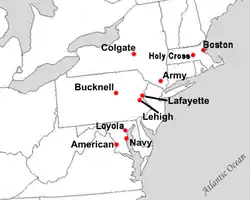 1. ^ a b c d e American, Boston University, and Loyola do not play football. As of the 2024 season, Army and Navy participate in the NCAA Football Bowl Subdivision (formerly Division I-A) as football-only members of the American Athletic Conference. Fordham and Georgetown replace them in the Patriot League for football only.
