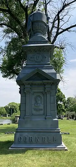 Paul Cornell established the Cornell Watch Factory at 76th Street and the Illinois Central tracks in 1876 in Grand Crossing.[25] Among his other ventures, Cornell founded Republic Life Insurance Company and the American Bronze Company.[5] He served as secretary for a group of Chicagoans who purchased 167 acres (0.68 km2) in 1853 to create Oak Woods Cemetery.[7] He has a 15 feet (4.6 m) tall zinc monument at the cemetery.[9]