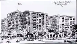 In 1887, Cornell built the Hyde Park Hotel (left, 1887–1963) on the former site of his home at Lake Park and East Hyde Park Boulevard.[22] The hotel was expanded in 1891.[22] In 1914, the hotel expanded (for a second time), which doubled its capacity to 300 rooms (see right).[22]