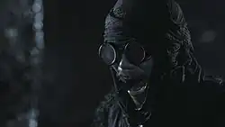 Robin Dunne altered his appearance for a more "post-apocalyptic warrior look." This included the addition of scars, a "funky eye" contact lens, and a mullet, which Kindler believed was "ubiquitous" for the look.[2] Tapping noted that seeing Zimmerman's altered appearance for the first time "creeped [her] out."[5] She also stated that while Dunne played the darker version of Zimmerman, she felt there were times he "really wanted to punch [her] in the face."[4] Martin Wood believed Dunne did "an amazing job" playing the most unlike Zimmerman.[7] Throughout filming, Dunne and Tapping performed their own stunts. The episode became one of the most expensive in the series, partially due to the rather extensive use of prosthetic makeup.[2] The destroyed city skyline was in fact a painting made by the production designers.[6] Andrew Lockington composed the score of the episode. Damian Kindler was receptive towards Lockington's work, stating that he "sustains this very very heavy tone, and he keeps it there."[2]