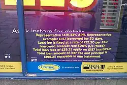 Under the Consumer Credit Act 1974 lenders must have a licence from the UK Office of Fair Trading (OFT) to offer consumer credit. The Consumer Credit Act 2006 explicitly requires the OFT to consider irresponsible lending in its evaluation of whether a lender is fit to hold a licence.[5] There are currently no restrictions on the interest rates payday loan companies can charge or on rolling over loans, however the government is pending new legislation to cap the costs of such loans.[6] Advertising of payday lending is subject to the Consumer Credit (Advertisements) Regulations 2004.[7] This means that the "typical APR" must be stated in adverts which meet certain criteria, such as adverts which indicate that credit will be given to customers who may otherwise find access to credit restricted.[8] Advertising is regulated by the Advertising Standards Authority (ASA), and there have been several cases of the ASA upholding complaints against advertising by payday lenders.[5]