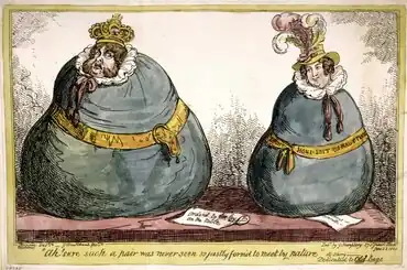 Other caricatures extended the pear's symbolic function to the entire body, reinforcing the metaphor by depicting a pear-shaped face on a pear-shaped body.[145] These representations are connected to physiognomic analysis, as noted by Martial Guédron, a field that also examined signs derived from the entire body, particularly the abdomen.[146][N 7] However, these caricatures focused on exaggerating the king's physical form, which, in turn, indirectly challenged his symbolic body—the foundation of his legitimacy.[148]