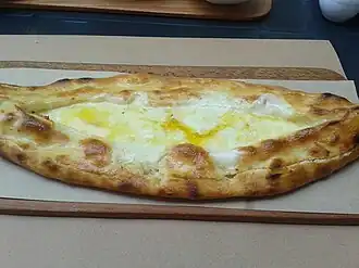 The peinirli (or penirli) is an elongated, open pie made in a boat shape. They contain a substantial amount of yellow cheese and optionally, meats or vegetables.[1] Peinirli originated in Turkey, where it is known as peynirli pide.[2] There are two types of pide: peynirli pide, in which cheese entirely covers the surface of the filling and karışık pide, which has cheese only as part of the filling (usually one third).