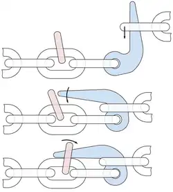It is composed of a hinged link held closed by a circumferential link capable of being released under load. Small examples are held closed by hand while the retaining link is displaced while larger examples are hit with a hammer or sledge hammer[1][2] to release.