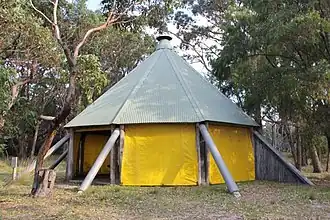 Inside the "Barn", the main feature of the open planned space was a giant, almost centrally placed steel fireplace and combustion stove mounted back to back, offset from the centre on the southern side. On the northern side of the stove, the open fireplace had natural stones forming a hearth and beyond was the combined living and dining space. A large rectangular dining table had log legs that were set permanently into the floor. The space is still furnished with the original deck chairs and Betty Grounds's bamboo hanging chair, which dates from the 1970s. To the west and in the same space was a double bed with a mosquito net suspended above. Behind the stove was an improvised galley kitchen with a gas fueled refrigerator, stainless steel sink and the combustion stove for cooking. Shelves, towel rails and benches made by Grounds complete the joinery and there is also a cabinet with impressive dovetail jointing that Grounds had made in the 1930s for his first house "Ranelagh", at Mt Eliza in Victoria. The hot water service was mounted above the stove and behind the flue, the entire set-up being designed by Grounds. The floor was lined with cylindrical wooden blocks that originally extended out, approximately one metre around the building. With time, the inside end grain blocks became smooth and shiny, their random pattern contributing to the overall rusticity of the grand, almost baronial, space. The outside blocks are completely rotted and gone. To the south and west, two bays of the externally exposed sloping frame were enclosed and roofed with yellow corrugated fibreglass. One bay became a sunken bathroom complete with a square hip bath, river pebbles and a tiny timber window hatch to ventilate the space. The original door to the bathroom was counterbalanced by a weighted tin can. Water was by run by pipe from the nearest of a number of dams and tanks installed by Grounds on the site. A septic tank was also installed. The external walls of the bathroom pod were lined vertically with Tanalith treated saplings. The roof to the bathroom was originally translucent yellow fibreglass, giving a diffused yellow light. The second bay was used for storage, in particular for the batteries storing the energy produced by the wind tower.[3][1]