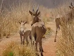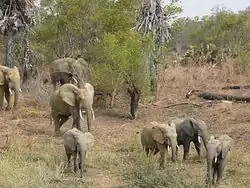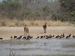 Pendjari National Park has a relatively large population of elephants, which was stable over the last decades and counted more than 800 individuals between 2005 and 2010.[1] The WAP Complex's elephant population is more than 3,800, making it the largest elephant concentration in all of western Africa.[2] The second largest species of the park is the hippopotamus. There are also large populations of several other large herbivores like African buffalo (Syncerus caffer brachyceros; c. 2,700 animals in 2000), western hartebeests (Alcelaphus buselaphus major; c. 1,500 in 2000), roan antelope (c. 2,000 in 2000), kob antelope (c. 2,600 in 2000), and warthogs. Some other antelope species like korrigum (Damaliscus lunatus korrigum), bushbuck, and reedbuck are relatively rare. Smaller bovids are the red-flanked duiker, oribi, and common duiker. Primates are represented by the olive baboon, patas monkey, and tantalus monkey.[3]