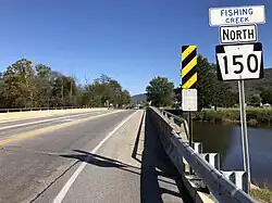 PA 150 intersects PA 550, with that route forming a concurrency with PA 150, heading into the borough of Bellefonte. The road becomes South Water Street and passes residences and a few businesses, crossing a Nittany and Bald Eagle Railroad line and curving to the north. PA 550 splits from PA 150 by heading east on West High Street, and PA 150 continues through more commercial areas along the east bank of Spring Creek on North Water Street. The route comes to an intersection with PA 144, where that route turns north to join PA 150, with the road heading north into areas of homes and businesses. PA 144/PA 150 enters Spring Township again and becomes Pleasantview Boulevard, heading into wooded areas with some commercial development, curving to the northeast before heading to the northwest. The road passes through a gap in forested Bald Eagle Mountain and crosses into Boggs Township, turning to the north again. PA 144/PA 150 heads into the borough of Milesburg and becomes Turnpike Street, passing homes. The two route turn northwest onto Mill Street and pass businesses, crossing Bald Eagle Creek. Past this, the road becomes a divided highway, soon widening to four lanes as it crosses over a Nittany and Bald Eagle Railroad line and comes to an interchange with US 220 Alternate.[2][3]