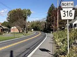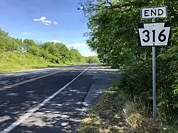 When routes were legislated in Pennsylvania in 1911, what is now PA 316 was not given a number.[4] PA 316 was designated in 1928 to run from the Maryland border south of Waynesboro north to US 11 in Chambersburg. The route followed Anthony Highway, State Hill Road, and Clayton Avenue north to PA 16 in Waynesboro before it picked up its present alignment to Chambersburg. Upon designation, the route was paved between the state line and PA 16 and Waynesboro and between New Franklin and Chambersburg.[5] By 1930, PA 316 was under construction between Waynesboro and Elbrook.[6] PA 316 was extended north from Chambersburg to PA 944 south of Upper Strasburg in 1937, running concurrent with US 11 to downtown Chambersburg and following US 30 west before heading northwest along Franklin Street and Edenville Road towards Upper Strasburg. At this time, the entire length of PA 316 was paved. In addition, the current route along Wayne Highway and Potomac Street south of Waynesboro became a southern extension of PA 997 in 1937, which was paved.[7][8] In the 1940s, PA 316 and PA 997 switched alignments south of Waynesboro, with PA 316 routed to follow Wayne Highway and Potomac Street between MD 60 at the Maryland border and PA 16 in Waynesboro.[9] In addition, the north end of PA 316 reverted to US 11 in Chambersburg, with a portion of the former route north of Chambersburg becoming an unnumbered road while most of the road between Chambersburg and Upper Strasburg was removed to make way for the Letterkenny Army Depot.[9][10]