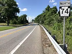PA 74 begins at the Maryland border in Peach Bottom Township in York County, where the road continues south into that state as MD 165. From the state line, the route heads north as two-lane undivided Delta Road, passing through fields and woods with commercial development as it bypasses the borough of Delta to the west. The road curves northeast and then north and intersects the eastern terminus of PA 851 and Broad Street at a roundabout. PA 74 continues north through a mix of farmland and woodland with some homes, curving to the northwest and crossing the Muddy Creek into Lower Chanceford Township. The route turns west to remain along Delta Road and curves northwest through more agricultural areas with occasional residences. The road intersects the western terminus of PA 372 before it passes through the communities of Sunnyburn and Kyleville. Farther northwest, PA 74 reaches the community of Airville, where it intersects PA 425 and forms a concurrency with that route. The two routes curve west and pass residences and businesses before PA 425 splits to the southwest. PA 74 continues northwest through farmland with some wooded areas and homes. The route enters Chanceford Township and passes through the community of Collinsville, where it heads near homes before running past farms and a few businesses. The road curves to the west and heads through the community of Brogue as it runs through agricultural areas with some development. PA 74 runs west-northwest through more rural land and passes through the community of Keys before it crosses into Windsor Township. Here, residential development along the route increases as it continues near more farms with some woods, passing through the community of Petersburg and curving to the west.[2][3]