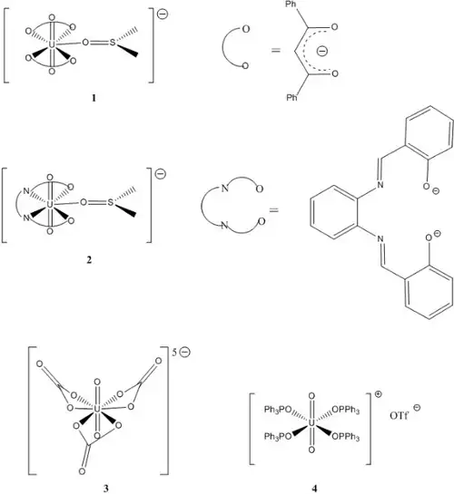 9. ^ Mizuoka, K.; Kim Re, S.Y.; Hasegawa, M.; Hoshi, T.; Uchiyama, G.; Ikeda, Y. (2003). "Electrochemical and Spectroelectrochemical Studies on UO2(saloph)L (saloph =N,N'-Disalicylidene-o-phenylenediaminate, L = Dimethyl Sulfoxide orN,N-Dimethylformamide)". Inorg. Chem. 42 (4): 1031–1038. doi:10.1021/ic0260926. PMID 12588135.