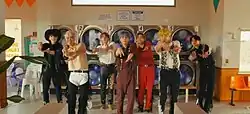 Set in a post-pandemic world,[35] the band members are seen dancing in multiple settings including a sunny locale, a laundromat, and a patio.[36] The video's emphasis on service workers echoes the message of BTS's 2018 song "Anpanman," which was inspired by the Japanese picture book hero of the same name and was a promise by the members to give their all in improving the lives of fans; when they debuted their performance, they dressed in the uniforms of firefighters and construction workers, the everyday superheroes who do the same. Similar scenes can be seen in "Permission to Dance," which also features scenes of masked-up employees being welcomed back to work after a year away, a server dancing by herself in a deserted restaurant, a janitor dancing with a teacher in a deserted school hallway, and a mail carrier spotting one of those ubiquitous purple balloons while performing her job. The last 60 seconds of the music video are devoted to the team that works with BTS behind the scenes, and they include a large group of stylists, choreographers, makeup artists, and everyone else who contributes to the creation of music by dancing to the song's choreography with the members.[37]