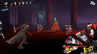 The battle gameplay remains faithful to the Persona series, using the turn-based system with the "1 more" mechanic when striking enemies' weaknesses. However, unlike the main series, activating "1 more" is always followed by specific skills instead of giving the player complete control over their additional action, and not all enemies can be "downed" in one turn, as some were given a meter that dictates the necessary number of attacks. When all enemies are down, the player can perform a powerful "All-Out Attack".[3][4]