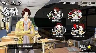 As the male silent protagonist (who is named by the player, though he is canonically named Nagisa Kamishiro[d], but also given the codename Wonder) attending the school in modern-day Tokyo, players experience the story events, answer questions in class, and freely explore the city after school or during days off in order to engage in various activities.[4] Some help Wonder earn experience points or money, while others improve his social stats, such as Knowledge or Courage, which affect the gameplay in other ways. Additionally, players can consult the "City Schedule" feature to see the list of suggested activities and available rewards.[3]