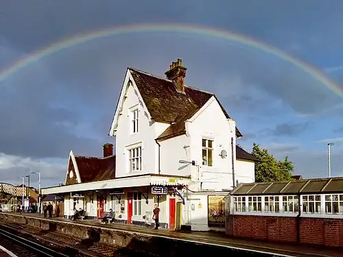 The station has two tracks, and two platforms, although in the past had a third platform branching into the coal yard situated adjacent to the station and a fourth platform on the north side of the level crossing serving the branch to Midhurst closed in 1955. The main buildings date back to the opening of the line in 1859 and are of a "town" type, larger than other wayside stations on the route but identical to Godalming. The signal box, situated by the level crossing at the north-east end of the station, is an LSWR Type 3a box and a Grade II listed building.[2]