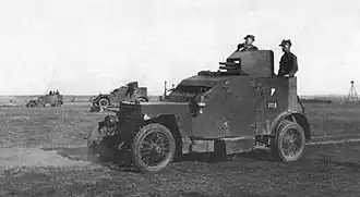 Two Peugeot armoured cars armed with machine guns were purchased by Romania and assigned to Grupul de automitraliere (lit. 'Auto machine gun group') in 1916. The group was reorganized as Grupul de autoblindate (Armoured car group) in November 1916 after the reception of another two armoured cars. The unit, consisting of Peugeot and Renault armoured cars, participated with the cavalry brigade in the offensive of the Romanian Second Army on the Soveja road, and in the defence of Grozești in 1917.[5] Some Peugeot armoured cars were still in service with reconnaissance units of the cavalry regiments at the start of World War II, but were likely withdrawn shortly afterwards.[6]