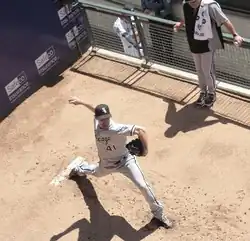 On December 17, 2010, Humber was claimed by the Oakland Athletics, who had extra room on their 40-man roster at the time of the waiver claim.[101] However, the team subsequently filled its 40-man roster and designated Humber for assignment later that off-season in order to make room on their roster for Guillermo Moscoso, whom the Athletics acquired from the Texas Rangers in a trade during January 2011.[103] The Chicago White Sox claimed Humber off waivers from the Athletics on January 18, 2011.[104] He signed a contract worth $500,000 for the season.[45] White Sox pitching coach Don Cooper worked with Humber, as he replaced his cut fastball with a slider and improved his pitching mechanics in the fashion originally recommended by Peterson in 2005.[2][45]