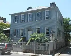 The Philip Porcher House was built on what had previously been part of a 34-acre plantation located outside the city limits of Charleston, South Carolina.[1] The lands passed to Isaac Mayzck and then, after his death in 1735, to his son, Isaac Mayzck II.[1] The younger Isaac Mayzck gave land at the corner of Archdale and Magazine Streets to his daughter, Mary Mayzck Porcher, for her and her husband, Philip Porcher, to build a house.[1] The house they built is similar to plantations of the time, built on a high foundation. Unlike similarly styled houses of the time, the house has two drawing rooms on the first floor rather than locating one on the second floor.[1] Instead, there are four bedrooms on the second floor.[1]