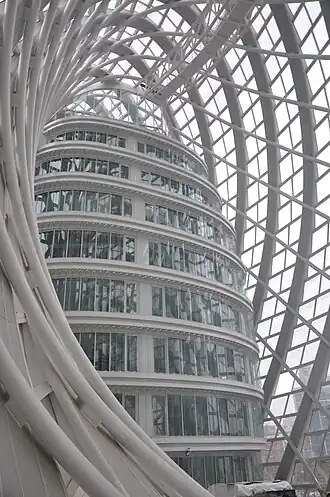 According to Architect Shao Weiping, the design of the building resembles DNA-like double helix that has been wrapped into a loop.[4] He adds that the circular contours of the Phoenix complex echo the yin-yang symbol of ancient Chinese philosophy. The Phoenix Centre is notable for being an experimental building designed by a domestic firm.[5] Within the doughnut-shaped exterior "shell" are two conventionally-structured interior towers.[6]