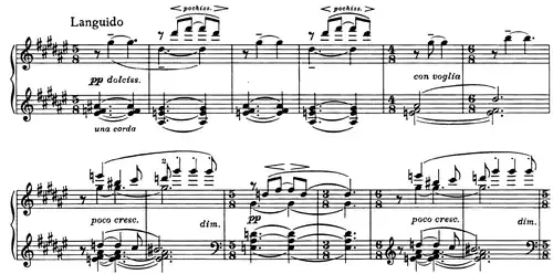 The work features one of the strange occurrences of the complete mystic chord spelled in fourths (mm. 264 and 268). Jim Samson[9] points out that it fits in well with Scriabin's predominantly dominant quality sonorities and harmony as it may take on a dominant quality on C or F♯. This tritone relationship between possible resolutions is important to Scriabin's harmonic language, and it is a property shared by the French sixth (also prominent in his work).