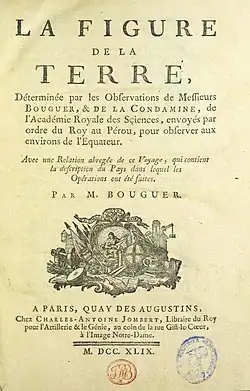 In 1735 Bouguer sailed with Charles Marie de La Condamine on a scientific mission to Peru, to measure the length of a degree of latitude in the meridian arc near the equator. Ten years were spent in this operation, a full account of which was published by Bouguer in 1749, La figure de la terre (French for "the figure of the earth").[3]