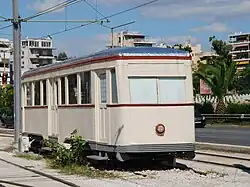 The rolling stock was made in Italy by OM-CGE-Breda Costruzioni Ferroviarie. It consisted of 12 (numbered from 71 to 82) very innovative for the time electric vehicles, fitted with pantograph, Scharfenberg couplers and driver operated pneumatic doors.[3] The vehicles could reach a speed of 50 kilometres per hour (30 mph) and had enough space for about 100 passengers. The "little trains", as the locals affectionally called them, were stored and serviced in the depot located in the Hellenic Electric Railways premises, next to Piraeus station. Some survive at various locations e.g. Kasomouli and Pikrodaphne tram stop used as rest places for the tramway drivers, STASY S.A. children's camp at Varybobi, Thission depot of ex ISAP, Greek Railway Museum but none are in good condition.
