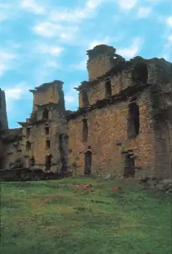The Fortress of Piruro II can be found on the right side of the river Tantamayo over 3.8 km above sea level. The first archaeological inspections of the fortress happened during the explorations of Bertrand Flornov around the years 1957 and 1975, and excavations are attributed to Lois Girault between 1968 and 1970, the carbon dating from those examinations give a date between 1930 and 2100 years B.C., meaning this fortress was built in the pre-ceramic period. Girault found architectonic remnants of hewn stones that seem similar to those found in Kotosh and certain walls located in Chavin. The fortress is composed of walls built with stones hewn in squared shape and uniform size. The building is a five-story structure with rectangular doors and windows on its front area. In front of the building, there is a spacious open area that resembles a park. At the center of this area, there are remnants of a stone and mud structure that are partially buried underground. Currently the building is enclosed by stone walls measuring approximately 1 1/2 meters in height. Two rectangular doors protrude from these walls, providing access to the interior. Adjacent to the building, there is also a 4-meter-high stone tower. This tower is situated near a section of the structure's rear where some stones bulge out, that were used as a makeshift ladder.[4]