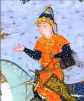 Tabari says that Sarm and Tuj ruled the earth for 300 years after they had killed their brother.[107] Manushihr, a descendant of Iraj,[108] becomes king and avenges Iraj's murder, by killing Sarm and Tuj. Manushihr's rule was "described as just and generous".[107] Towards the end of his reign, he is attacked by Frasiyab, king of Turan (that is of the Turks) and a descendant of Tuj. An agreement is made whereby the boundary between their realms is set by having an Iranian archer shoot an arrow from a mountain and where it lands will form the frontier. The arrow landed near Balkh at the Oxus river, which becomes the boundary between the Iranians and the Turks.[109]