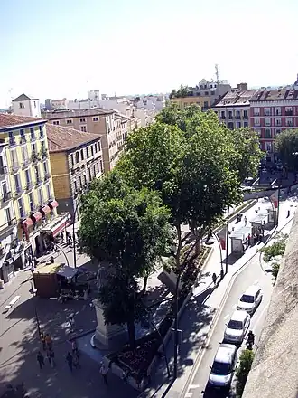 Created upon the demolition of the Convento de la Merced during the early years of the reign of Isabella II, it was inaugurated under the name of Plaza del Progreso ("Square of the Progress"), with some trees planted on the plot.[2][3] After the 1868 Glorious Revolution, the square gained a statue of Juan Álvarez Mendizábal, precisely the minister behind the ecclesiastical confiscation.[2] After the Francoist victory in the Civil War, the statue of Mendizábal was replaced in 1943 by another one representing Gabriel Téllez (best known as "Tirso de Molina").[4]