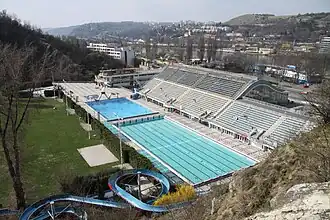 Podolí Swimming Stadium (in Czech: Plavecký stadion Podolí) is a swimming centre in Prague, Czech Republic, which is located on the right side of Vltava river in Podolí neighborhood.[1] It contains two 50 meter-long pools (outside and inside), 33 meter pool for water polo, spa or other facilities including seating for 5000 spectators.[2][3] It was built between 1959 and 1965 on the site of a former mine. Design of the complex, symbolizing a big water wave, was created by a Czech architect Richard Podzemný.