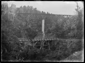 Over a kilometre north of Pokaka,[26] Manganui o te Ao Viaduct is a straight viaduct, 290 ft (88 m) long and up to 112 ft (34 m) above Manganui o te Ao River, supported by a single concrete pier.[27] Each 1908 girder was 122 ft (37 m) long, with 230 tons of steel in the bridge,[28] costing £8,840.[29] The original viaduct was replaced in 1967,[24] or 1964, by a slightly longer 91 m (299 ft) reinforced and pre-stressed concrete viaduct.[11]