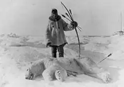 Bears hunt walrus groups by provoking them into stampeding and then look for young that have been crushed or separated from their mothers during the turmoil.[101] There are reports of bears trying to kill or injure walruses by throwing rocks and pieces of ice on them.[111] Belugas and narwhals are vulnerable to bear attacks when they are stranded in shallow water or stuck in isolated breathing holes in the ice.[112] When stalking reindeer, polar bears will hide in vegetation before an ambush.[76] On some occasions, bears may try to catch prey in open water, swimming underneath a seal or aquatic bird. Seals in particular, however, are more agile than bears in the water.[113] Polar bears rely on raw power when trying to kill their prey, and will employ bites and paw swipes.[96] They have the strength to pull a mid-sized seal out of the water or haul a beluga carcass for quite some distance.[114] Polar bears only occasionally store food for later—burying it under snow—and only in the short term.[115]