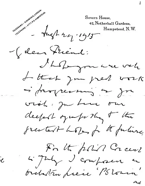 For the Polish Concert in July I composed an orchestra piece 'Polonia' as a small personal tribute to you; founded upon some Polish themes the work had success: in the middle section I have brought in remote & I trust with poetic effect a theme of Chopin & with it a theme of your own from the Polish Fantasia linking the two greatest names in Polish music – Chopin & Paderewski. I hope that you will one day hear the piece &, it may be, approve.