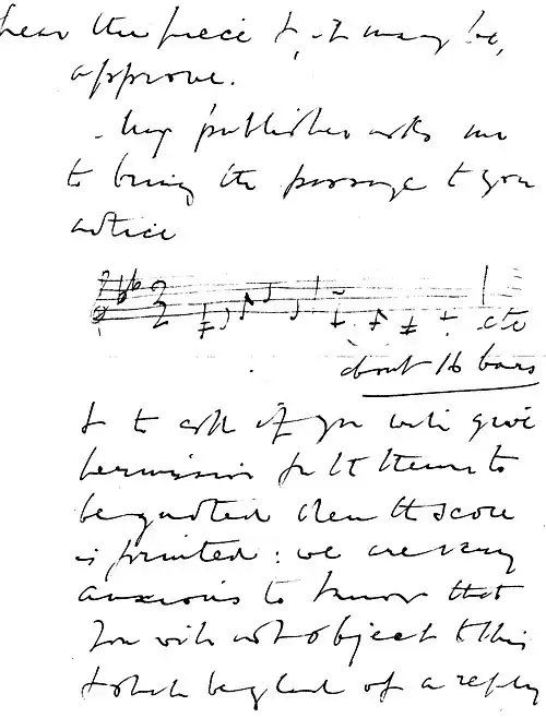 & to ask you if you will give permission for the theme to be quoted when the score is printed: we are very anxious to know that you will not object to this & shall be glad of a reply as early as you can conveniently find.